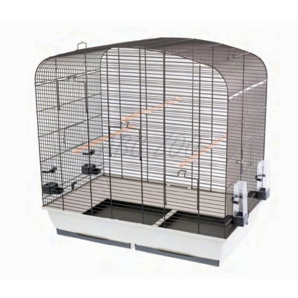 Velká klec pro malé a střední ptáky s bohatým vybavením. Černá mřížka. Světle šedá barva vaničky. Více detailů