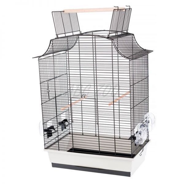 Klec pro střední papoušky. Černá mřížka, světle šedá barva vaničky. Více detailů