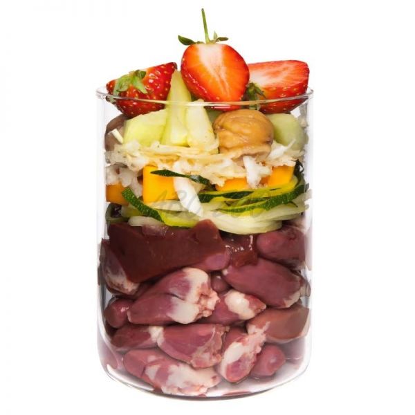 Složení: Kachní srdce (50 %), dýně (12 %), mrkev, kachní játra (6 %), cuketa, celer (5 %), meloun, jablko, sladké kaštany (1,5 %), jahody (1 %), řepkový olej, ústřice*, pivovarské kvasnice*, květ černého bezu* (0,4 %), semínka psyllia*, řeřicha*, pampeliška*, minerální jíl*, petržel*, andská sůl, mořské řasy*, minerály