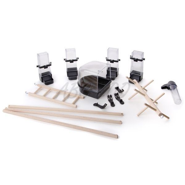 3× dřevěné bidýlko1× dřevěný žebřík1× dřevěná hračka4× plastové krmítko1× plastová napáječka1× vanička2× plastová výsuvná zásuvka