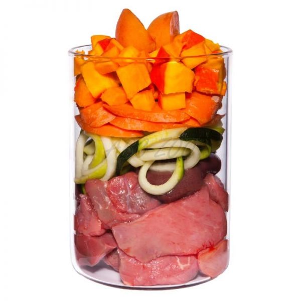 Poměr Maso : zelenina/ovoce/byliny : ostatní suroviny = 59 % : 38 % : 3 %