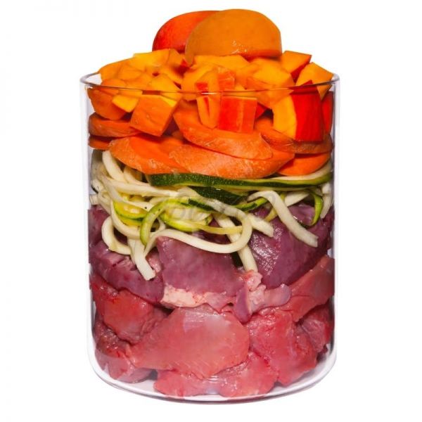 Poměr Maso : zelenina/ovoce/byliny : ostatní suroviny = 59 % : 38 % : 3 %