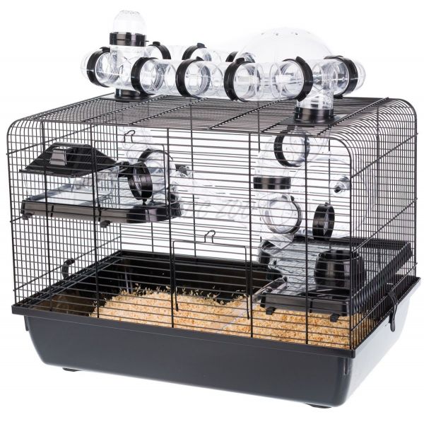 Klec pro křečky se zábavnými hračkami. Černá barva vaničky. Více detailů