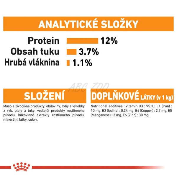 Analytické složky: Bílkoviny: 12,0 %, tuky: 3,7 %, hrubý popel: 1,6 %, hrubá vláknina: 0,9 %, vlhkost: 77,5 %, omega-3 mastné kyseliny: 0,27 %, EPA/DHA: 0,14 %, omega-6 mastné kyseliny: 1,1 %.