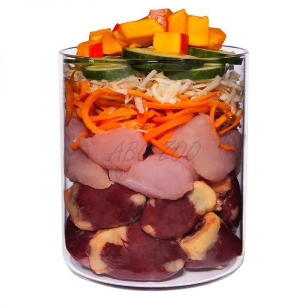 Poměr Maso : zelenina/ovoce/byliny : ostatní složky = 64 % : 33 % : 3 %