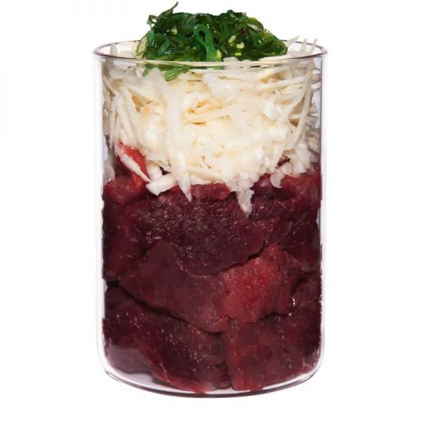 Nutriční doplňkové látky/kg: Vit. A (3a672a): 8300 IU, vit. D3 (3a671): 370 IU, měď (3b405): 2 mg, mangan (3b503): 9,8 mg, jód (3b201): 0,6 mg, zinek (3b603): 20 mgPoměr Maso : zelenina : ostatní suroviny = 60% : 36% : 4%