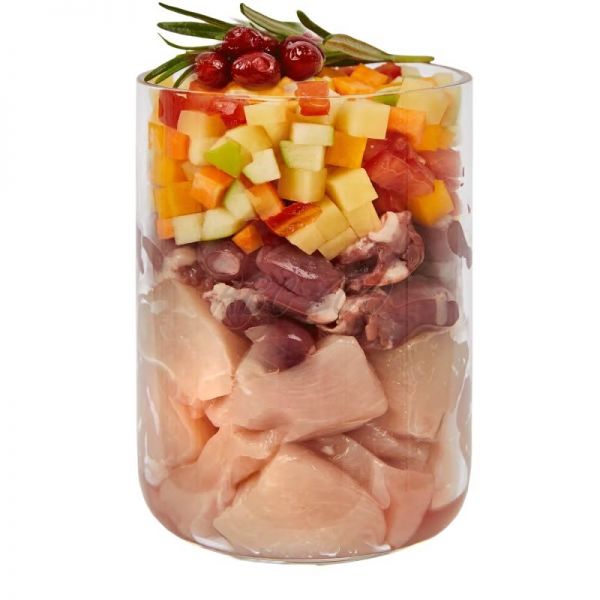 Složení: Kuřecí srdce (27 %), kuřecí žaludky (27 %), kuřecí prsa (13 %), dýně, brambory, sladké brambory (4 %), rajčata (4 %), celer (2 %), jablka (1 %), brusinky (0,6 %), řepkový olej, pivovarské kvasnice*, ústřice*, strouhaný kokos, bazalka* (0,1 %), rozmarýn (0,1 %), sezam*, minerální jíl*, oregano*, andská sůl, mořské řasy*, minerální látky