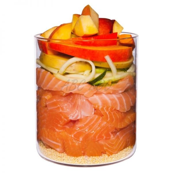 Poměr Ryby : zelenina/ovoce/byliny : proso : ostatní suroviny = 56 % : 35,5 % : 6,5 % : 3 %