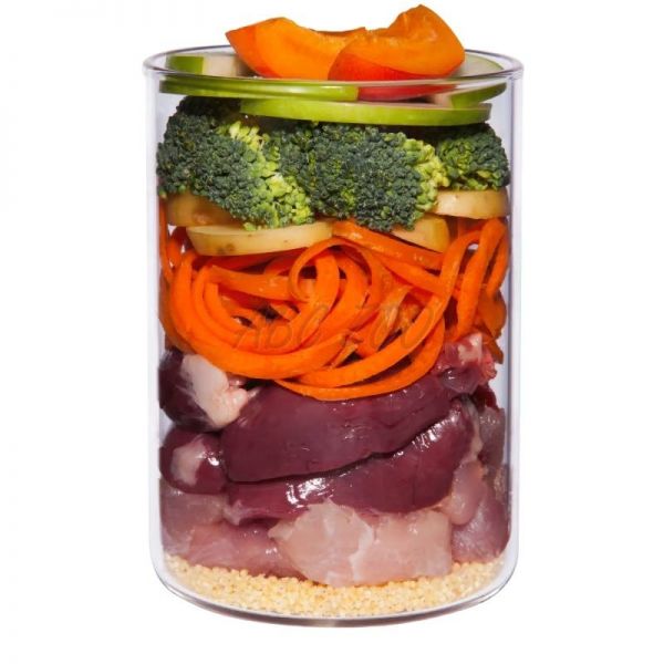 Poměr maso : rýže natural : zelenina/ovoce/byliny : ostatní složky = 55 % : 37 % : 6 % : 2 %