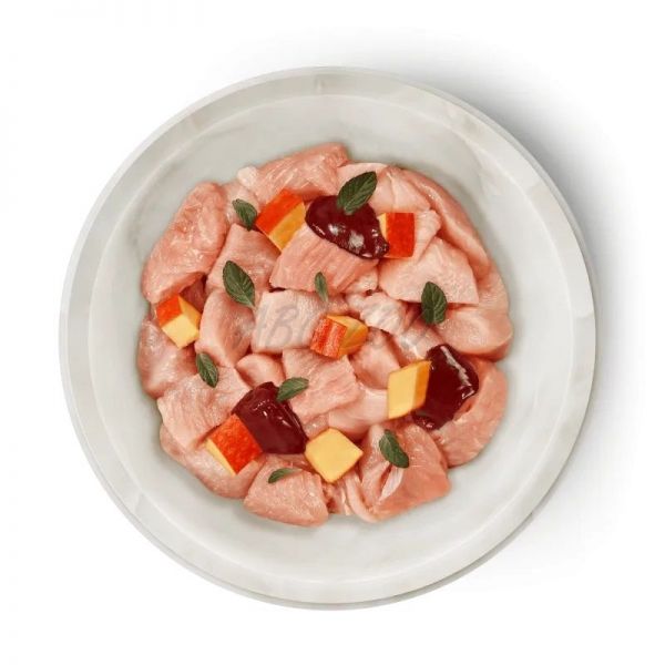 Poměr maso : zelenina/ovoce/bylinky : ostatní složky = 90 % : 6 % : 4 %