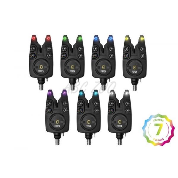 Tón signalizace (spínač T) a citlivost v rozmezí 1-9cm (spínač S) lze navolit podle potřeby až z pěti možností. Při "padáku" resp. zpětném záběru budete upozorněni odlišným tónem. Hlasitost lze nastavit také v pěti různých úrovních, přičemž úroveň 0 představuje tichý mód. Nespornou devizou signalizátorů ze sady FORZA je možnost vybrat si ze 7 barev signalizační LED diody. Každý si tak vybere svou oblíbenou a pokud zatoužíte po změně, tak si jednoduše zvolíte jinou barvu pomocí otočného spínače "C (colour)" a nemusíte tak kupovat nový signalizátor. Ve spodní části se nachází vstup pro 2,5 mm konektor pro připojení svítícího indikátoru záběru. Každý signalizátor navíc disponuje závity na upevnění "snag gear", které jsou i součástí balení. Navíc k signalizátorům získáváte pevný transportní kryt a k přijímači stolní držák!