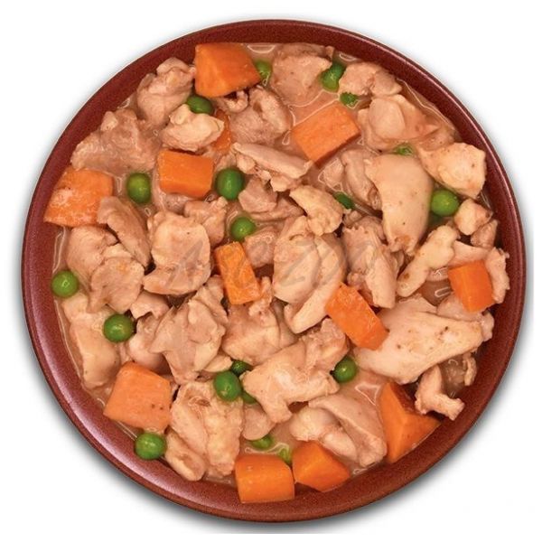 Složení: 97 % čerstvé kuřecí maso v omáčce z vlastní šťávy, sladké brambory, hrášek, mrkev, koření