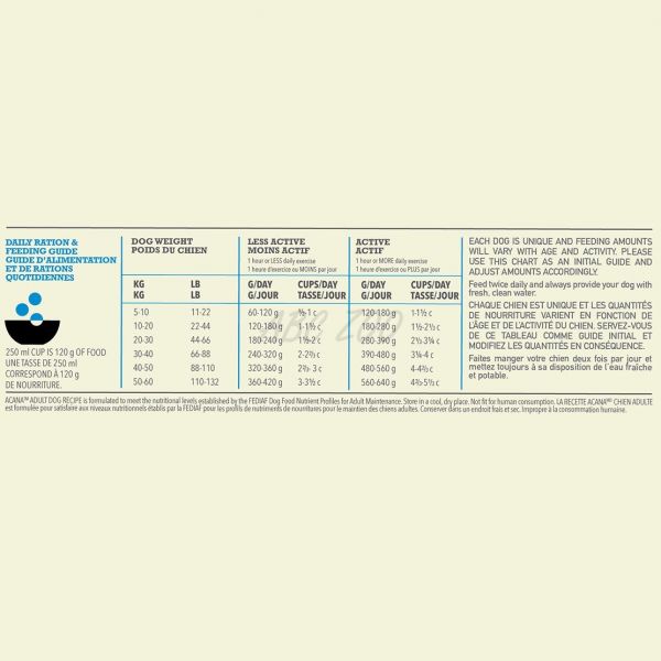 Granule Acana Adult jsou plné čerstvých místních surovin, jako je volně chovaná drůbež, vejce z volného chovu, ryby z přírodních lovů a na slunci zrající ovoce a zelenina. Všechny tyto výživné suroviny dodávají krmivu chuť a zajišťují vrcholovou kondici malých plemen.