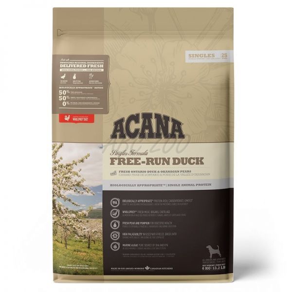 Složení: čerstvá kachna 18 %, dehydrované kachní maso 17 %, celý zelený hrách, celá červená čočka, čerstvé kachní droby (játra, srdce, ledviny) 7 %, kachní tuk 6 %, čerstvé hrušky bartlett 4 %, celá cizrna, celá zelená čočka, celý žlutý hrách, sušené kachní chrupavky 2 %, vláknina z čočky, mořská řasa (zdroj DHA a EPA) 1,2 %, čerstvá celá máslová dýně, čerstvá celá dýně, sušená mořská řasa, mrazem sušená kachní játra 0,1 % , sůl, čerstvé celé brusinky, čerstvé celé borůvky, kořen čekanky, kurkuma, ostropestřec, kořen lopuchu, levandule, kořen ibišku, šípky.