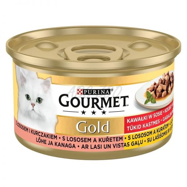 Konzerva Gourmet GOLD - kousky ve šťávě s lososem a kuřecím 85 g, 24+12 ks ZDARMA