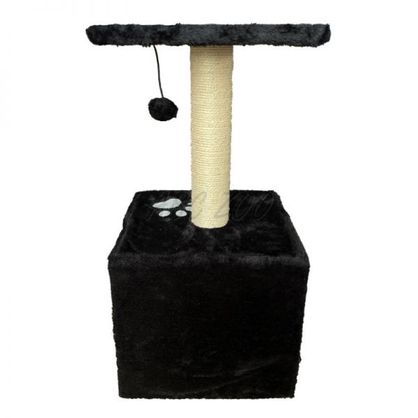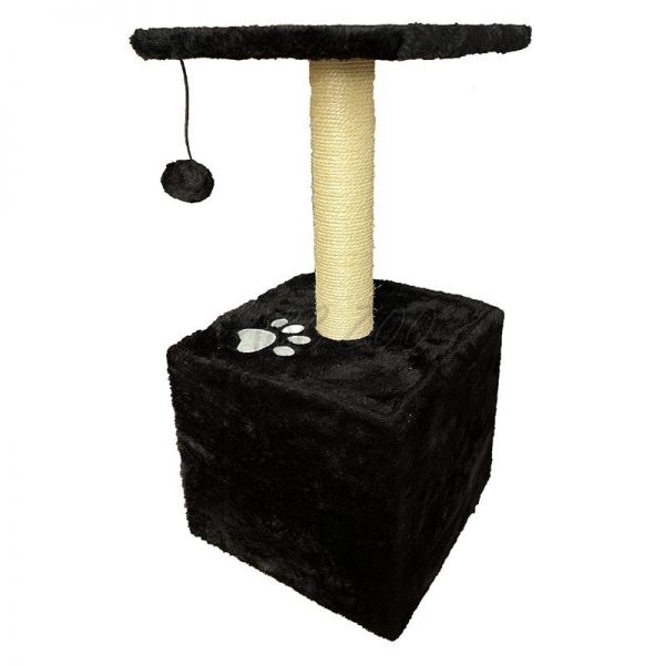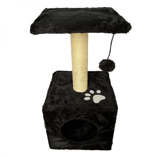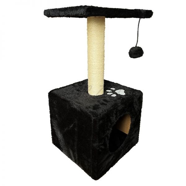 Multifunkční škrabadlo pro kočky, které kombinuje odolný sisalový sloupek na škrábání, plyšovou odpočívací plochu a útulný domek na schování. Díky závěsné hračce ve tvaru kuličky poskytuje také interaktivní zábavu, čímž snižuje nudu a nežádoucí stres. Elegantní černé provedení s motivem tlapky zapadne do každého interiéru. Ideální pro kočky všech věkových kategorií a velikostí.