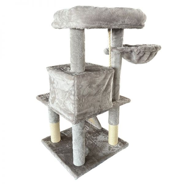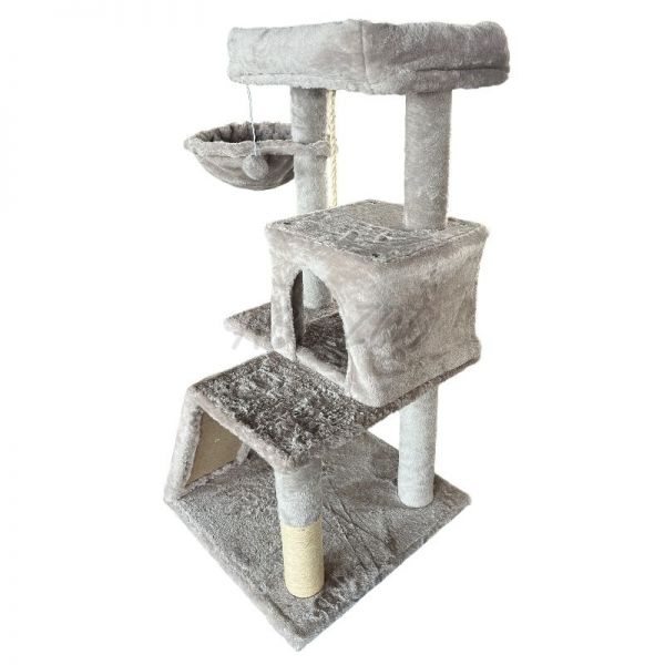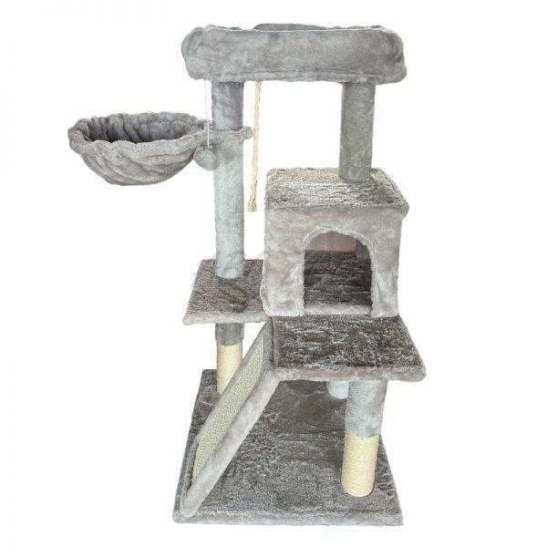 Toto škrabadlo nabízí prostorný pelíšek, útulný domeček na skrývání, měkký závěsný pelíšek a hrací míček, díky čemuž se stává ideálním místem na hraní i relaxaci. Sloupky obalené sisalem pomáhají kočce přirozeně si brousit drápky bez poškození nábytku. Díky šikmé škrabací ploše a několika úrovním je vhodné i pro starší nebo méně pohyblivé kočky.