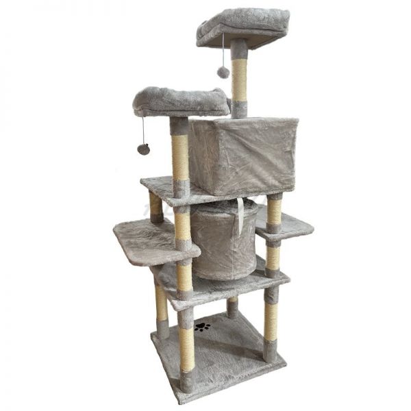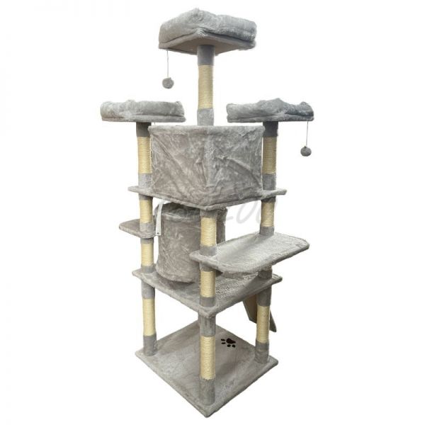 Tento vysoký a stabilní škrabací strom je ideální pro domácnosti s jednou nebo více kočkami, které potřebují prostor pro aktivní trávení času i klidné útočiště. Nabízí kombinaci různých prvků, jako jsou vyhlídky, domečky, rampy a hračky, čímž poskytuje kočkám maximální pohodlí a zábavu. Sisalové sloupky podporují přirozený instinkt koček na škrábání, čímž chrání váš nábytek před poškozením.