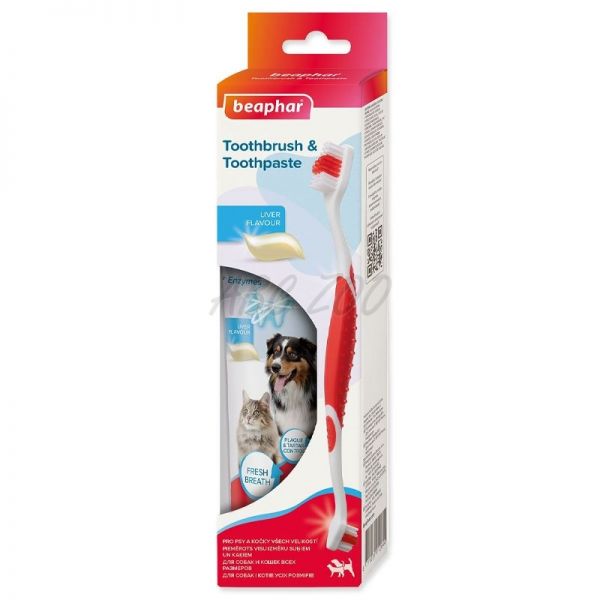 Zubní pasta s játrovou příchutí ničí bakterie, které způsobují vznik zubního plaku. Pomáhá předcházet přeměně plaku na zubní kámen. Oboustranný zubní kartáček Beaphar je navržen s ohledem na tvar zubů vašeho psa či kočky. Různá délka štětin zaručuje pečlivé vyčištění všech zubů.