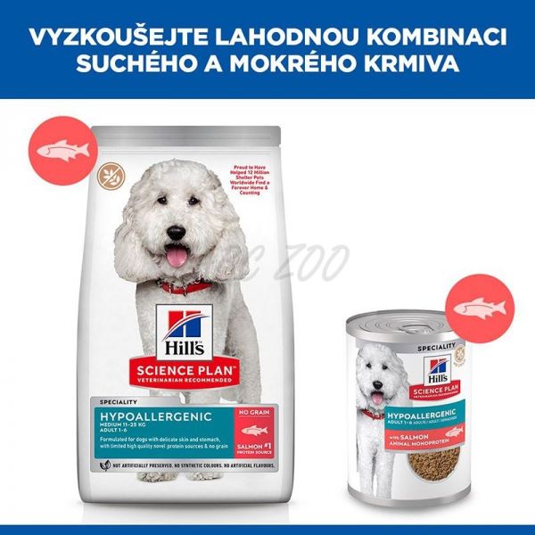 Mokré krmivo pro psy Hill's Science Plan Hypoallergenic s lososem je vyvážené krmivo bez obilovin pro dospělé psy ve věku 1 – 6 let. Krmivo s lososem jako jediným zdrojem živočišných bílkovin, snadno stravitelnými složkami a omega-3 a omega-6 mastnými kyselinami je vhodné pro citlivý žaludek, podporuje zdravou pokožku a můžete ho podávat spolu s jinými krmivy.