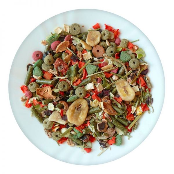 Složení: vojtěška, zelenina (mrkev, červená řepa, pastinák, petržel), extrudovaná pšenice, extrudovaná kukuřice, hrachové vločky, ovoce (jablka, banány), svatojánský chléb, oves, pšeničné vločky