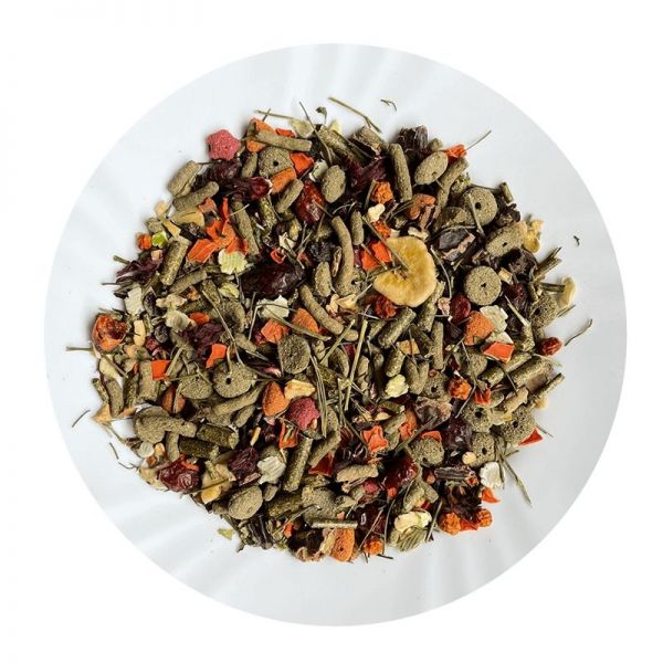 Vybraná a vyvážená krmná směs pro morčata vhodná pro dlouhodobé krmení, bohatá na celou zeleninu, ovoce, lupínky a jetelové kroužky.