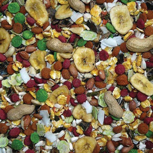 Složení: ovoce (banány, jablka, rozinky, bezinky), extrudovaná pšenice a kukuřice, pšeničné vločky, rohovník, burský oříšek, hrachové vločky, světlice barvířská, slunečnice, kukuřičné lupínky, čirok, ječmen, vojtěška, oves, mrkev, pohanka.