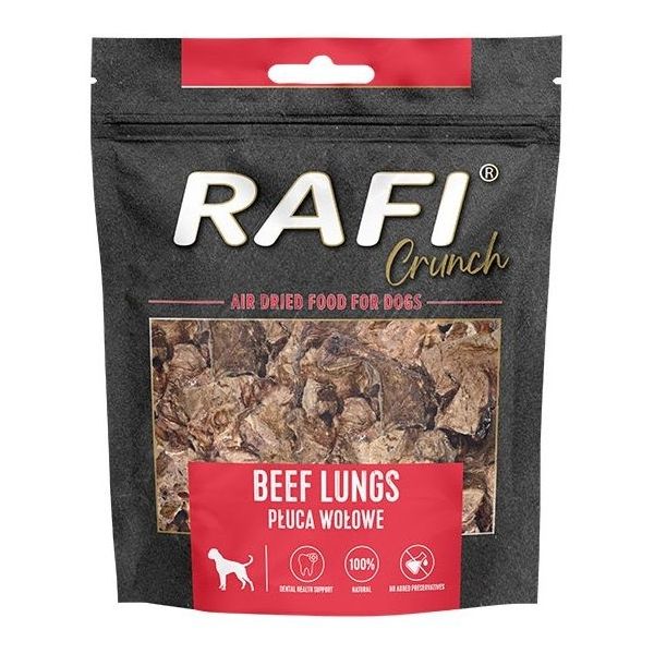 Sušené hovězí plíce Rafi Crunch jsou výjimečně lehké a křupavé žvýkací pamlsky s vysokým obsahem bílkovin (75 %). Mají nízký obsah tuku a jsou snadno stravitelné, díky čemuž jsou vynikající volbou pro psy s citlivým trávicím systémem. Žvýkání těchto pamlsků také pomáhá odstraňovat zubní plak a zároveň uspokojuje jejich lovecké instinkty.