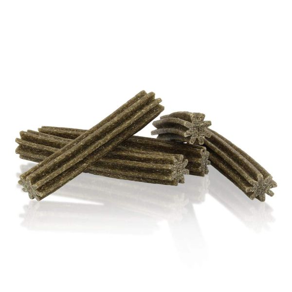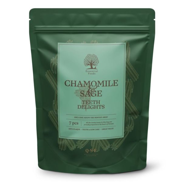 Funkční žvýkací pamlsky navržené pro podporu ústního zdraví a snížení tvorby zubního plaku. Kombinace heřmánku a šalvěje pomáhá přirozené hygieně dutiny ústní, zatímco jemná textura podporuje čištění zubů během žvýkání. Výjimečně chutné, vhodné i pro citlivé psy, bez umělých barviv a přidaného cukru.