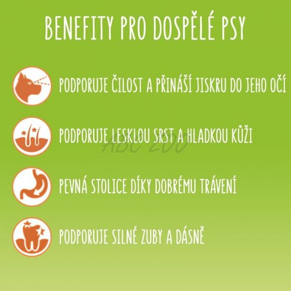 Složení: obilniny, vedlejší výrobky rostlinného původu, maso a výrobky živočišného původu (min. 4 % kuřecího masa), rostlinné oleje a živočišné tuky, zelenina, minerální látky.