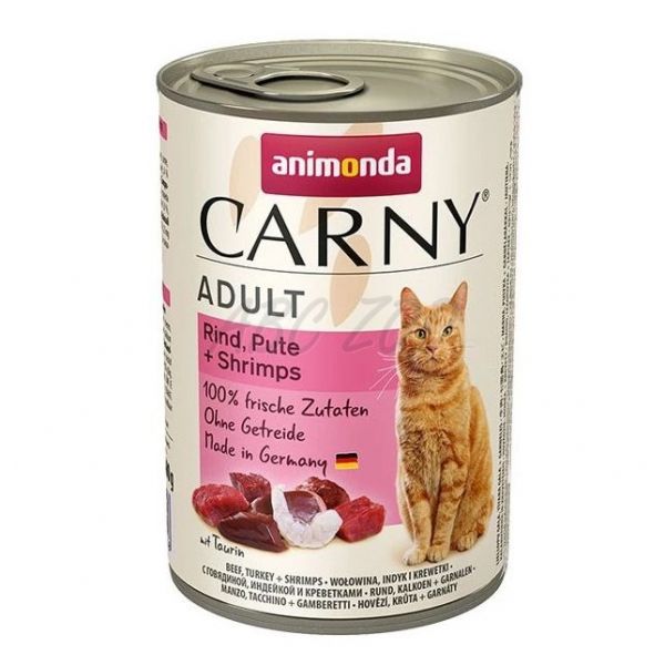 Masová konzerva pro dospělé kočky ANIMONDA CARNY s hovězím masem, krůtím a krevetami. Více detailů