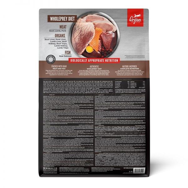 Jako masožravci jsou psi přizpůsobeni stravě, která je založena na bohatém a pestrém obsahu celého čerstvého masa s menším množstvím ovoce, bobulovin a travin. Krmivo Orijen nabízí všechny výhody syrové stravy, tak jak by je vašemu psovi nabídla sama příroda. Je šetrně sušené mrazem, aby si zachovalo přirozenou chuť čerstvých místních surovin.