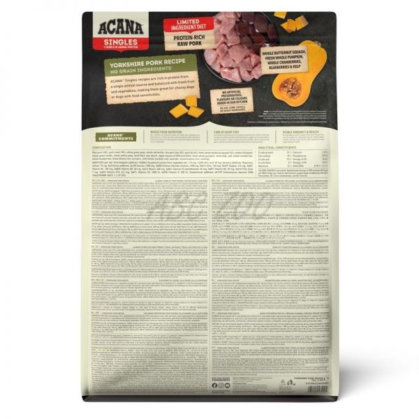 Složení: čerstvé vepřové 16 %, dehydrované vepřové maso 16 %, celý zelený hrách, celá červená čočka, vepřová játra 6 %, vepřový tuk 6 %, čerstvé vepřové ledviny 4 %, čerstvá celá máslová dýně 4 %, celá cizrna, celá zelená čočka, celý žlutý hrách, vepřové chrupavky 2 %, vláknina z čočky, mořská řasa 1,2 % (zdroj DHA a EPA), čerstvá celá dýně, sušená mořská řasa, mrazem sušená vepřová játra 0,1 %, sůl, čerstvé celé brusinky, čerstvé celé borůvky, kořen čekanky, kurkuma, ostropestřec, kořen lopuchu, levandule, kořen ibišku, šípky