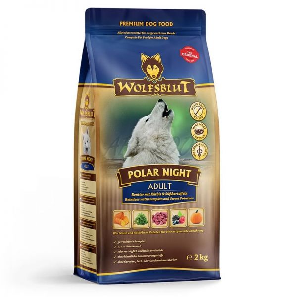 Složení: sobí maso (min. 51,1 %), sladké brambory (min. 24 %), dýně (min. 8 %), sušené koňské maso, koňský tuk, minerály, hrachový protein, tymián, majoránka, oregano, petržel, šalvěj, rajčatový protlak, Immutop ® (koncentrát z topinamburů), špenát, vitaminy, mrkvové vločky, ostružiny, maliny, borůvky, černý rybíz, bezinky, bobu aronie, fenykl, zelená řasa (Enteromorpha), Laminaria digitata (mořské zelí), irský mech, mořský salát (Lactuca ulva), lněná semínka, červená řepa, zelené fazolky, kopřiva dvoudomá, hloh, ženšen, máta, měsíček lékařský, sušené brusinky, pampeliška, mannanoligosacharidy (MOS probiotika), fruktooligosacharidy (FOS probiotika), extrakt z juky. Doplňkové látky: vitamín A (retinylacetát) 22746 IU, vitamin D3 (cholekalciferol) 1530 IU, vitamin E (alfa-tokoferol acetát) 745 IU, taurin 1100 mg; stopové prvky: kalciumjodát bezvodý 1,64 mg, selen 0,24 mg, železo 92,53 mg, měď 23,78 mg, zinek 166,29 mg, mangan 42,55 mg, aminokyseliny: DL-methionin 2211 mg, L- karnitin 85 mg. Analytické složky: hrubý protein 24 %, hrubý tuk 10 %, hrubý popel 10 %, vlhkost 8 %, hrubá vláknina 3,5 %, vápník 2,25 %, fosfor 1,6 %.