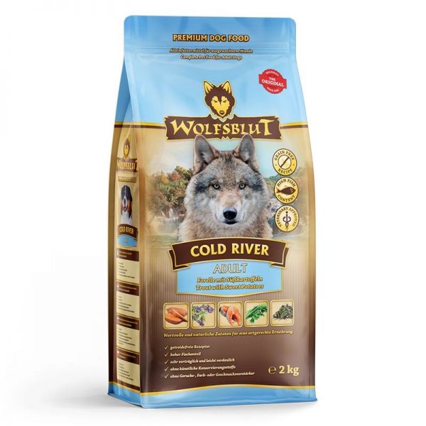 Složení: ryby 42 % (čerstvý pstruh 25 %, sušený losos 7 %, sušený pstruh 7 %, lososový olej 2 %, vývar z lososa 1 %), sladké brambory 29 %, brambory 18 %, minerální látky, topinambury, cizrna, řasa, irský mech, mořský salát, spirulina, kopřiva dvoudomá, hloh, pampeliška, ženšen, mannanoligosacharidy (MOS probiotika), fruktooligosacharidy (FOS probiotika), extrakt z juky. Doplňkové látky: vitamin A (retinylacetát) 21871 IU, vitamin D3 (cholekalciferol) 1471 IU, vitamin E (alfa-tokoferol acetát) 710 IU, taurin 1000 mg; stopové prvky: kalciumjodat bezvodý 1,58 mg, selen 0,23 mg, železo 89 mg, měď 23 mg, zinek 159,8 mg, mangan 44,7 mg; aminokyseliny: DL-methionin 2126 mg, L-karnitin 82 mg.Analytické složky: hrubý protein 18,5 %, hrubý tuk 9 %, hrubý popel 8,5 %, vlhkost 8 %, hrubá vláknina 3 %, vápník 2,02 %, fosfor 1,08 %.