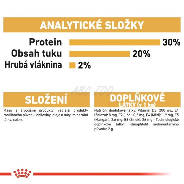 Složení: maso a produkty živočišného původu, produkty rostlinného původu, obilniny, minerální látky, oleje a tuky, různé cukry.