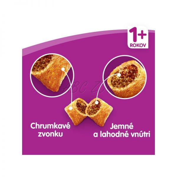 Složení: cereálie, maso a vedlejší produkty živočišného původu (29 %, včetně 4 % hovězí v červených kouscích), oleje a tuky, rostlinné bílkovinné extrakty, vedlejší produkty rostlinného původu, minerální látky, zelenina (4 % mrkve v oranžových kouscích, 4 % hrách v zelených kouscích).