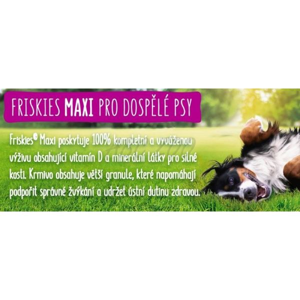 PURINA FRISKIES VITAFIT Maxi, chutnou recepturu s hovězím, v kombinaci s celozrnnými obilovinami, vitamíny skupiny B a omega-3 a 6 mastnými kyselinami. PURINA FRISKIES VITAFIT Maxi poskytuje 100% kompletní a vyváženou výživu včetně vitamínu D a minerálních látek pro silné kosti. Krmivo je tvořeno většími granulemi, které napomáhají správnému žvýkání a přispívají k udržení zdraví zubů.