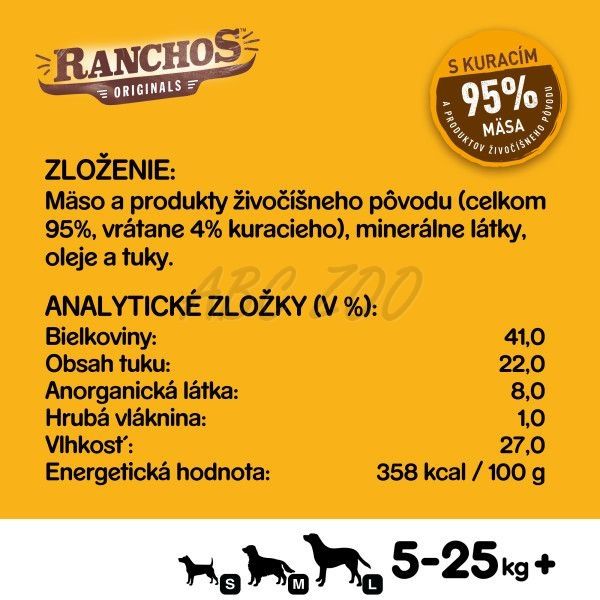 Složení: maso a živočišné deriváty (celkem 95 %, včetně 26 % kuřecího), minerály, oleje a tuky.