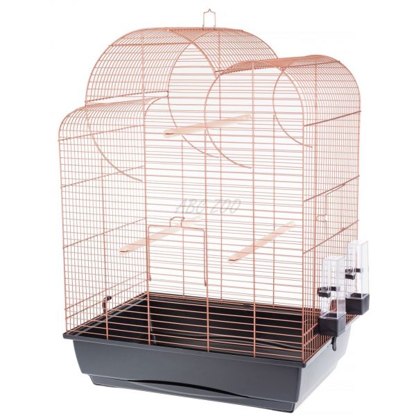 Elegantní klec pro papoušky s kompletním vybavením. Měděná mřížka, černá miska. Více detailů