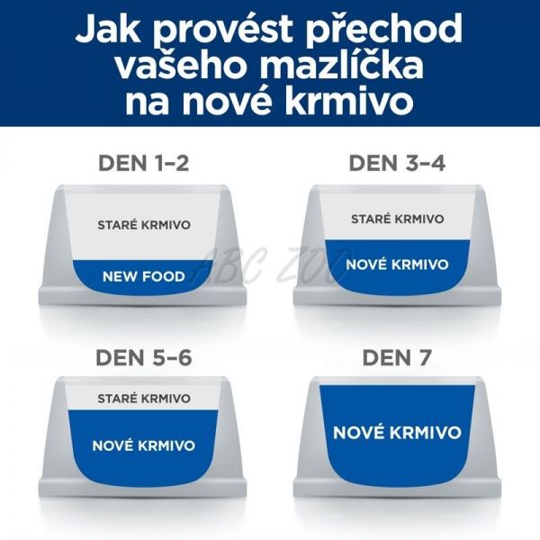 Krmte výhradně doporučeným krmivem PRESCRIPTION DIET. Před použitím požádejte svého veterináře o konkrétní pokyny ke krmení vašeho domácího mazlíčka. Kompletní pokyny ke krmení najdete v balení. Denní doporučení krmení jsou pouze vodítkem, jak začít. Pokud si nejste jisti, zeptejte se svého veterináře. Zajistěte stálý přístup k čerstvé vodě. Podáváte toto krmivo poprvé? Míchejte zvyšující se podíl nového krmiva se snižujícím se podílem dosavadního krmiva v průběhu 7 dnů. Zajistěte stálý přístup k čerstvé vodě. Nutriční potřeby vašeho mazlíčka se mohou s věkem měnit. Zeptejte se svého veterináře při každé prohlídce.