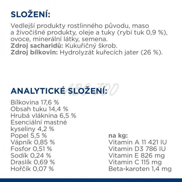 SLOŽENÍ: Deriváty rostlinného původu, maso a živočišné produkty, oleje a tuky (rybí tuk 0,9 %), ovoce, minerální látky, semínka. Zdroj bílkovin: Hydrolyzovaná kuřecí játra. Zdroj sacharidů: Kukuřičný škrob.