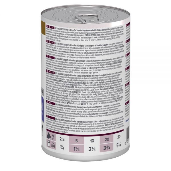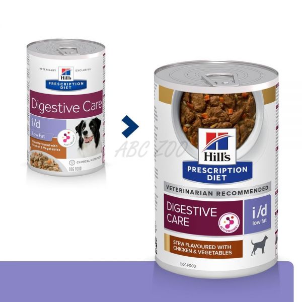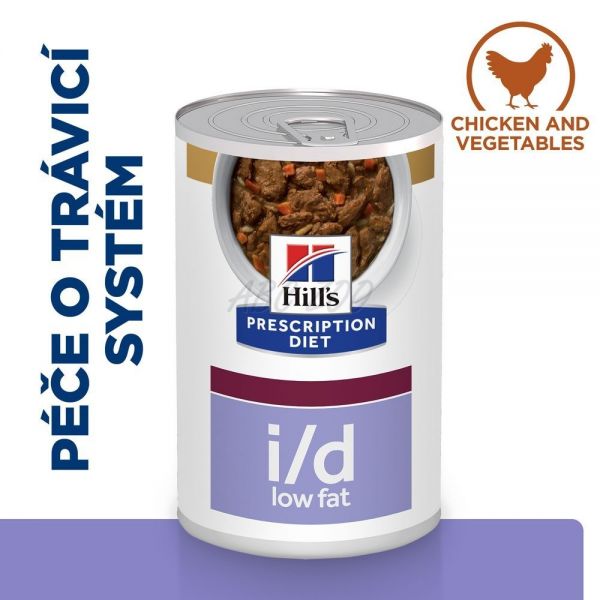 Hill's PRESCRIPTION DIET i/d Low Fat Stew krmivo pro psy ochucené kuřetem a zeleninou a s nízkým obsahem tuku je vysoce stravitelné kompletní dietetické krmivo používané ke zmírnění poruch vstřebávání živin ve střevech a ke kompenzaci špatného trávení a exokrinní pankreatické insuficience u dospělých psů. Toto dietetické krmivo má zvýšený obsah sodíku a draslíku a obsahuje vysoce stravitelné přísady.