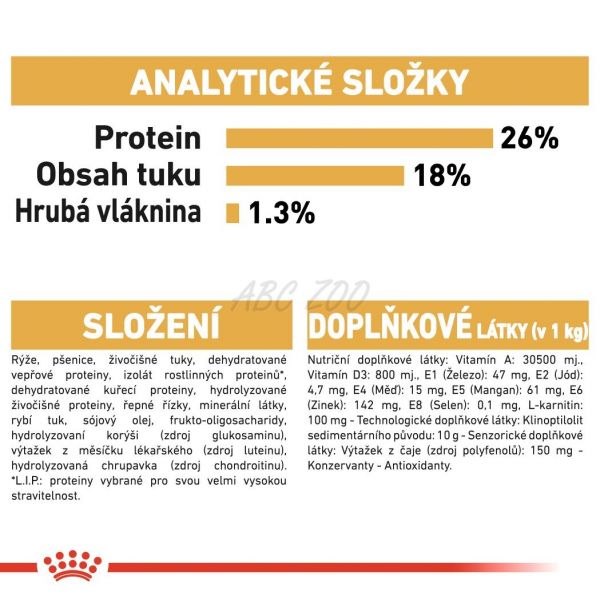Složení: Rýže, pšenice, živočišné tuky, dehydrované vepřové maso, izolát rostlinného proteinu (L.I.P. protein vybraný pro svou vysokou stravitelnost), dehydrované drůbeží maso, hydrolyzované živočišné proteiny, řepné řízky, minerály, rybí olej, sójový olej, fruktooligosacharidy, hydrolyzované korýši (zdroj glukosaminu), extrakt z měsíčku lékařského (zdroj luteinu), hydrolyzované chrupavky (zdroj chondroitinu).