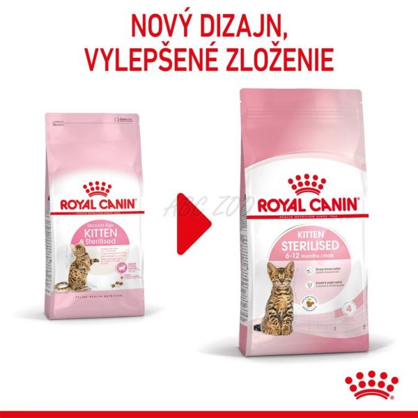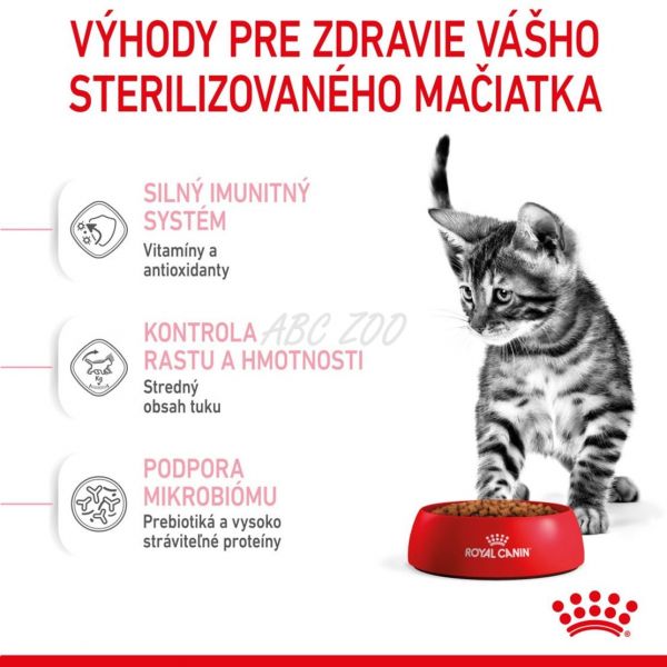 Krmivo poskytuje vaší kočce speciální kombinaci vitamínů, minerálů a patentovaného komplexu antioxidantů, které podporují obranyschopnost vašeho kotěte, když roste v silnou dospělou kočku. Kastrovaná koťata mají tendenci přijímat více potravy, zejména kvůli delšímu spánku, což vede ke snížení fyzické aktivity. Proto krmivo ROYAL CANIN® Kitten Sterilised obsahuje menší množství tuku, což usnadňuje udržení ideální hmotnosti, a správné množství bílkovin, vápníku a fosforu pro zdravý růst.