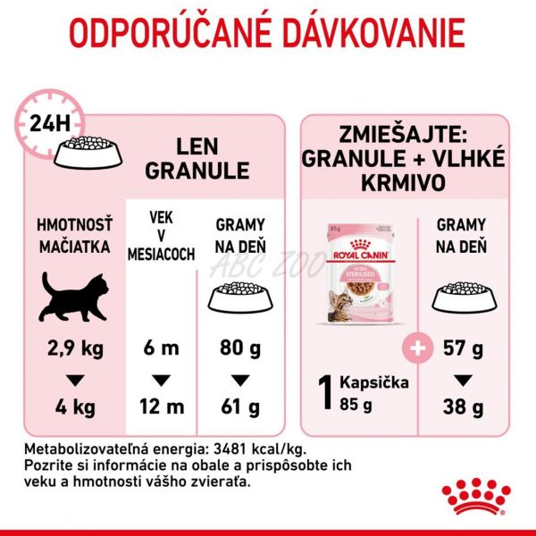 Pro uspokojení chutí co největšího počtu koček je krmivo ROYAL CANIN® Kitten Sterilised k dispozici také ve vlhké formě jako kousky v lahodné šťávě nebo ve šťavnatém želé. Pokud uvažujete o kombinovaném krmení, postupujte podle našich pokynů, aby vaše kočka dostávala správné množství suchého i mokrého krmiva.