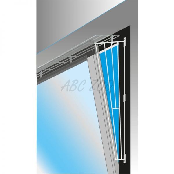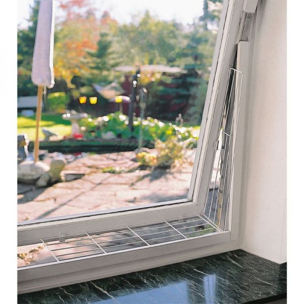 Okenní zábrana se zkoseným tvarem proti úniku koček. Více detailů