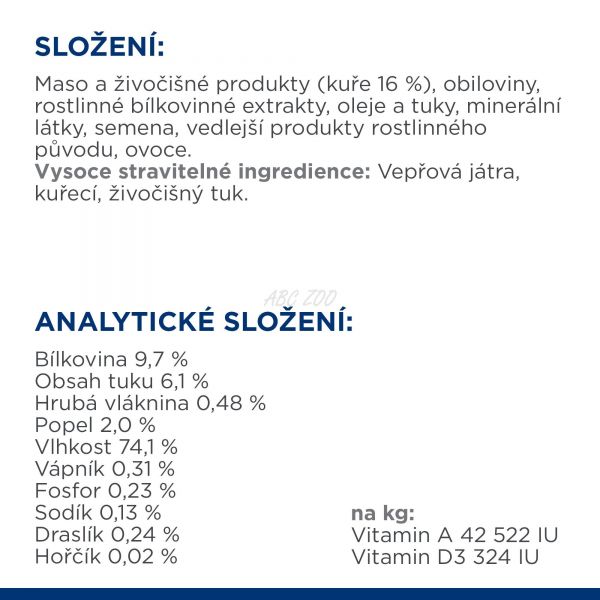 Složení: Maso a výrobky živočišného původu (kuřecí maso 16 %), obiloviny, rostlinné bílkovinné extrakty, oleje a tuky, minerální látky, semena, deriváty rostlinného původu, ovoce. Vysoce stravitelné složky: vepřová játra, kuřecí maso.