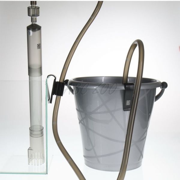 Použití: Podržte čistič štěrku pod vodou v akváriu, zatřeste jím nahoru a dolů a přidržte konec hadice uvnitř kbelíku. Voda pak bude proudit do kbelíku. Čističem štěrku vyčistěte dno. Pro dokončení jednoduše vyjměte čistič štěrku z vody nebo/i uzavřete kohoutek na konci hadice.