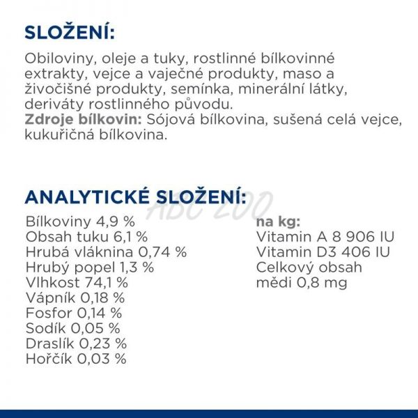 Podávejte výhradně doporučené krmivo PRESCRIPTION DIET. Před použitím požádejte svého veterináře o konkrétní pokyny ke krmení vašeho mazlíčka. Kompletní informace ke krmení naleznete na obalu. Denní doporučené dávky jsou pouze orientační hodnoty, ze kterých byste měli vycházet. Pokud si nejste jisti, poraďte se s veterinářem. Vždy musí být k dispozici čerstvá voda.